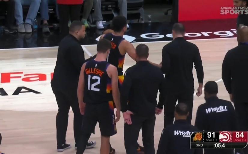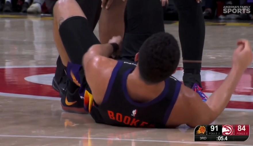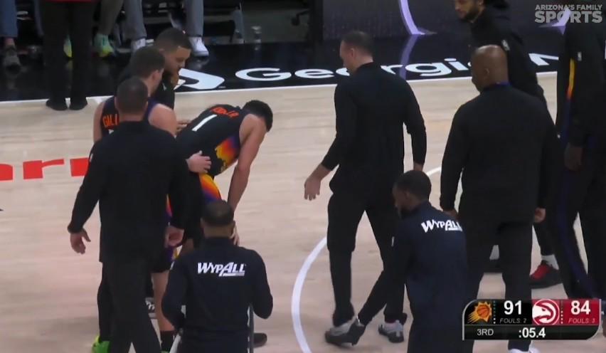 本场比赛,太阳队除了输球之外还两度遭遇球员伤情。在后,德文-布克在第三节最后时刻也遭遇伤情:他在太阳队最后一攻时注意力完全放在了后场推进的队友身上,结果却没看到身前的老鹰球员,右脚踩到了对方的脚造成90度崴脚。倒地后的布克表情非常痛苦,最终他在队友和工作人员的帮助下起身并回到了更衣室,最终他也提前退场。